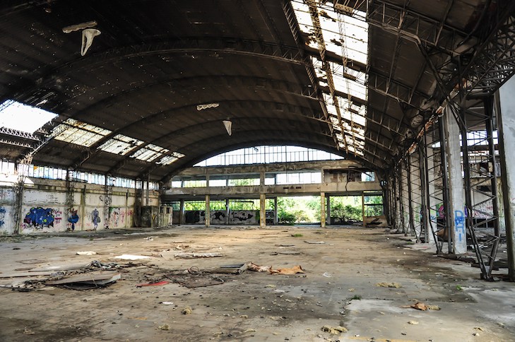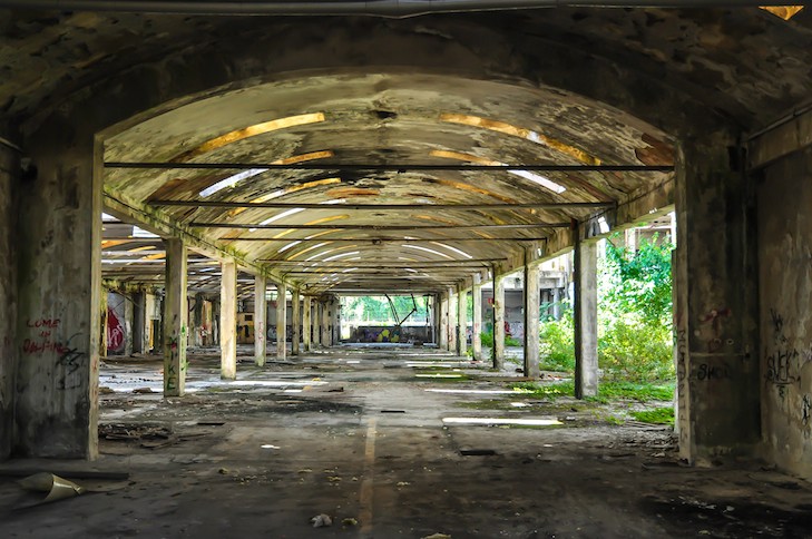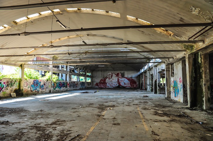 Lagerhallen, funkelnagelneuen Industrieanlagen und grasüberwachsener